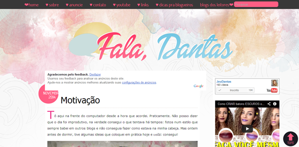 "Fala, Dantas! Tudo beleza?" A Jeu é a diva do make! Ela ensina a fazer muitas coisas, e eu adoro o blog dela. Conheci procurando dicas pra blogueiras á mais ou menos um ano. Ela é de Salvador e já participou de um concurso de Make lá na CH, esse ano, viu?! Mas, o mais legal é que ela não fica meio que "Ai nossa, sério mesmo isso? Aff! Mereço!!!" quando você pede ajuda com algo do blog que não sabe. Procurei ajuda com ela algumas vezes e ela foi muito legal! É bom conhecer uma blogueira que não deixa a fama - mesmo que pouca, até as vezes nenhuma - subir a cabeça. O que é o caso de muitas! ~ Click aqui pra visitar ~